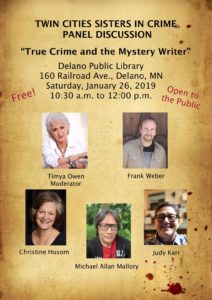 I’m looking forward to our TRUE CRIMES panel with Twin Cities Sisters in Crime friends Judy Kerr, Michael Allan Mallory, Frank Weber, and Timya Owen. Come and hear where our stories come from.